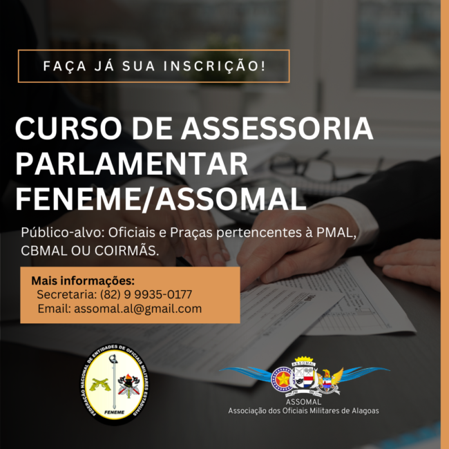 A Associação dos Oficiais Militares de Alagoas (ASSOMAL), em parceria com a Federação Nacional de Entidades de Oficiais Militares Estaduais (FENEME), abriu inscrições para o Curso de Assessoria Parlamentar FENEME/ASSOMAL – Edição 2026. A iniciativa será realizada em Maceió, disponibilizando 60 vagas destinadas a oficiais e praças da PMAL, CBMAL ou COIRMÃS. O curso tem…