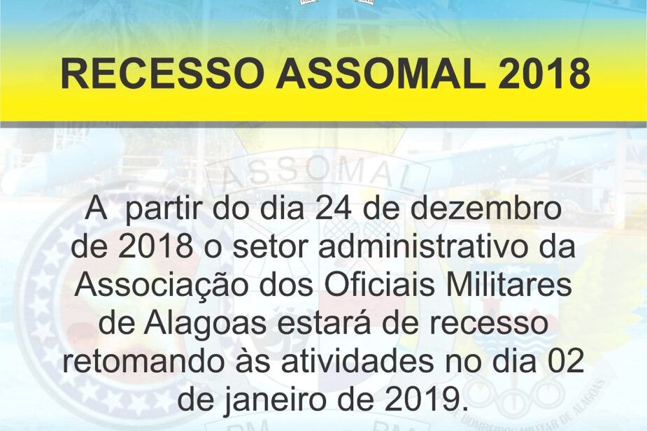 A Assomal comunica o recesso de final de ano do setor administrativo da entidade. A partir do dia 24 de dezembro de 2018 até 02 de janeiro de 2019. Obs.: O clube funcionará normalmente durante o recesso!