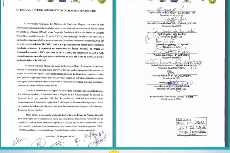 Nesta quarta-feira (25), o Movimento Unificado dos Militares do Estado de Alagoas protocolou no Palácio do Governo um ofício que retrata as demandas dos policiais e bombeiros militares alusivas a reposição do acumulado do Índice Nacional de Preços ao Consumidor Amplo — IPCA dos anos de 2018 e 2019, somada a perspectiva do índice de…