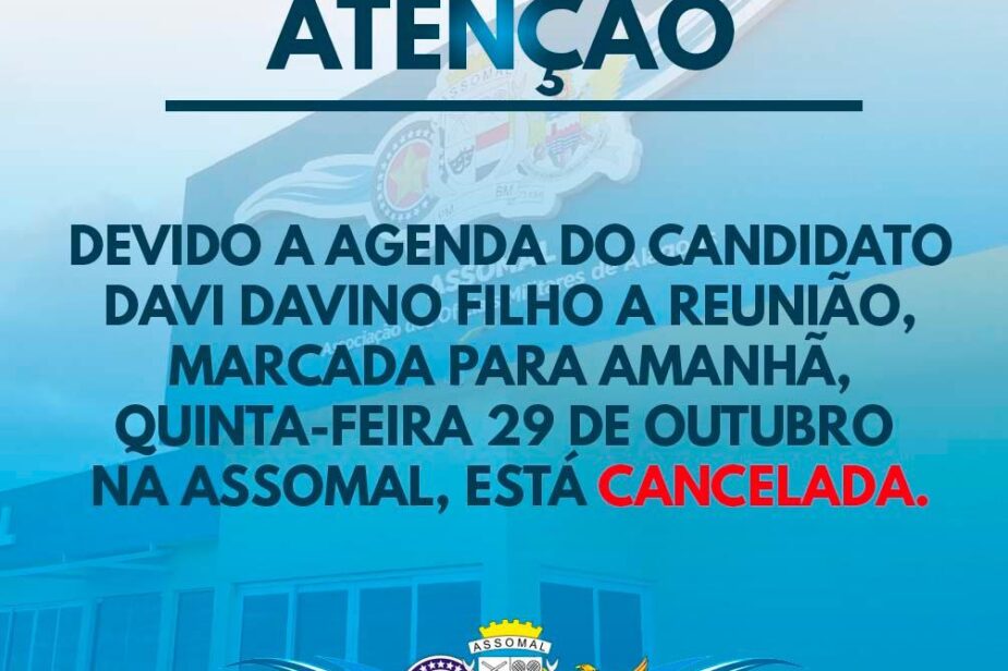 A reunião marcada para amanhã, quinta-feira 29 de outubro, na Associação dos Oficiais Militares de Alagoas- Assomal com o candidato a Prefeito por Maceió Davi Davino Filho foi CANCELADA, devido a agenda do candidato. Em breve anunciaremos uma nova data.