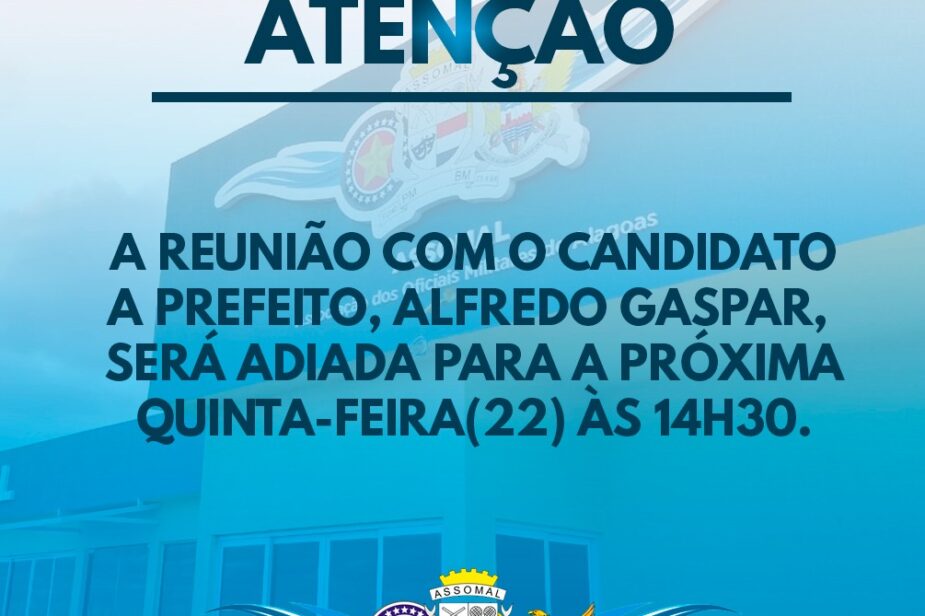 Devido a imprevistos pessoais do presidente da Assomal Ten Cel Olegário Paes, a reunião que estava marcada para hoje, quinta-feira 15 de outubro, na Assomal, com o candidato a prefeito por Maceió, Alfredo Gaspar (MDB), será adiada para a próxima quinta-feira (22) às 14h30. O presidente da Assomal agradece a compreensão de todos e convida…