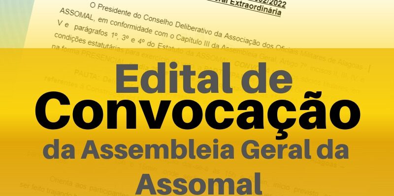 O Presidente do Conselho Deliberativo da Associação dos Oficiais Militares de Alagoas – ASSOMAL, Cel Valdécio Neves Nascimento, em conformidade com o Capítulo III da Assembleia Geral, Artigo 7º, incisos II, III, IV, e V e parágrafos 1º, 3º e 4º do Estatuto da ASSOMAL, convoca todos os sócios titulares, em condições estatutárias para exercício…