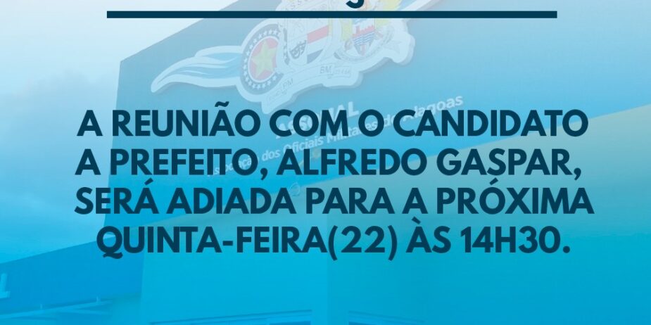 Devido a imprevistos pessoais do presidente da Assomal Ten Cel Olegário Paes, a reunião que estava marcada para hoje, quinta-feira 15 de outubro, na Assomal, com o candidato a prefeito por Maceió, Alfredo Gaspar (MDB), será adiada para a próxima quinta-feira (22) às 14h30. O presidente da Assomal agradece a compreensão de todos e convida…