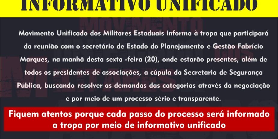 Movimento Unificado dos Militares Estaduais informa à tropa que participará da reunião com o secretário de Estado do Planejamento e Gestão Fabrício Marques, na manhã desta sexta -feira (20), onde estarão presentes, além de todos os presidentes de associações, a cúpula da Secretaria de Segurança Pública, buscando resolver as demandas das categorias através da negociação…