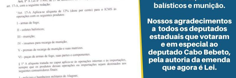 Na última quarta-feira (2) foi publicada no Diário Oficial Eletrônico Assembleia Legislativa de Alagoas, a Lei N° 8.355/2020 que reduz o ICMS no Estado de 25% para 12%, para agentes de Segurança Pública e CACs na compra de armamentos, colete balístico, munição, insumos e prensas de recarga. Esta conquista beneficia milhares de militares da PMAL…