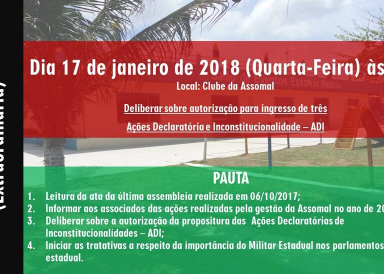 Senhores! Depois de 06 meses de negociação com o governo de Alagoas, na busca da nossa reposição salarial, sem sucesso, decidimos em reunião com as demais Associações Militares convocar os nossos associados para uma Assembléia Geral, no dia 18 de maio de 2017, às 14 horas, no clube dos Oficiais, para explanarmos todas as nossas…
