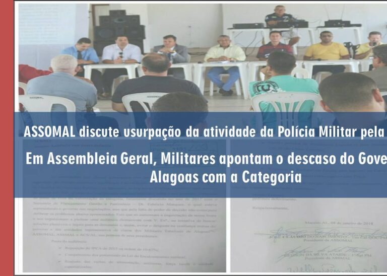 Em virtude do descumprimento dos prazos estabelecidos pelo Governo do Estado, que até a presente data não deu posição do reajuste salarial. As associações militares do Estado de Alagoas ASSOMAL, ASSMAL, ACSPMCBMAL, ASPRA, UPMAL, ASSORPOBOM, ABMAL, ARPMAL, estiveram reunidas na sede da Associação dos Oficiais Militares, na tarde desta quinta-feira (11) para convocar uma ASSEMBLEIA…