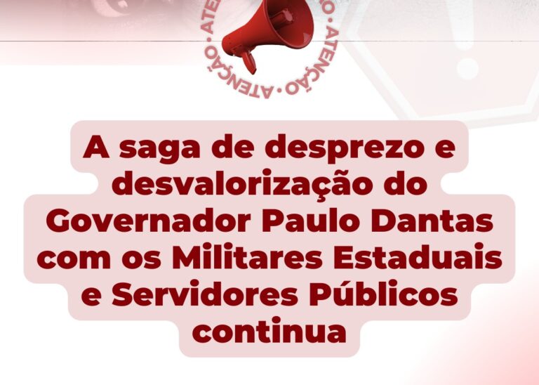 Mais uma vez, o Governo de Alagoas permanece em silêncio sobre as demandas represadas dos Militares Estaduais. No mês do trabalhador, quando se exalta a importância do trabalho e a valorização profissional, o governador Paulo Dantas não anuncia a reposição inflacionária dos Servidores e Militares Estaduais, nem mostra vontade política para negociação com as categorias.…